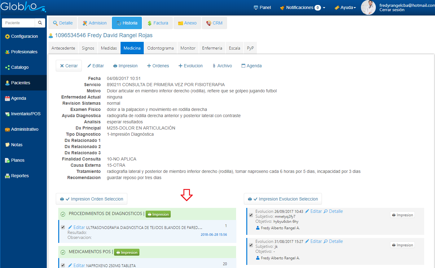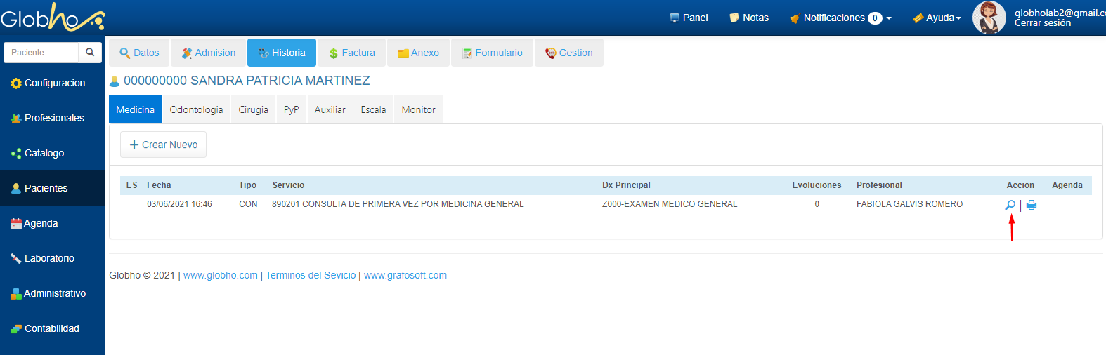 1. Selecciona el Paciente al que le vas a realizar la Orden Médica. Ver aquí 2. Haz clic en Historia y selecciona Medicina. 3. Sobre el registro de la Consulta previamente creada haz clic en el botón en forma de Lupa.