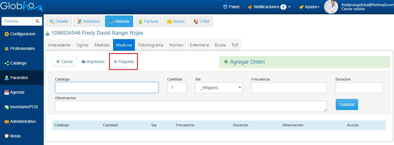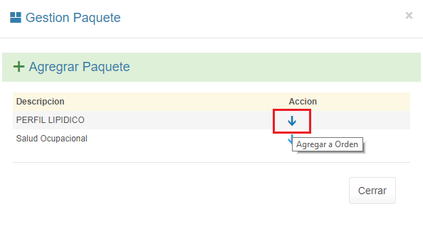 1. En el detalle de Orden Médica, haz clic en el botón + Paquete.