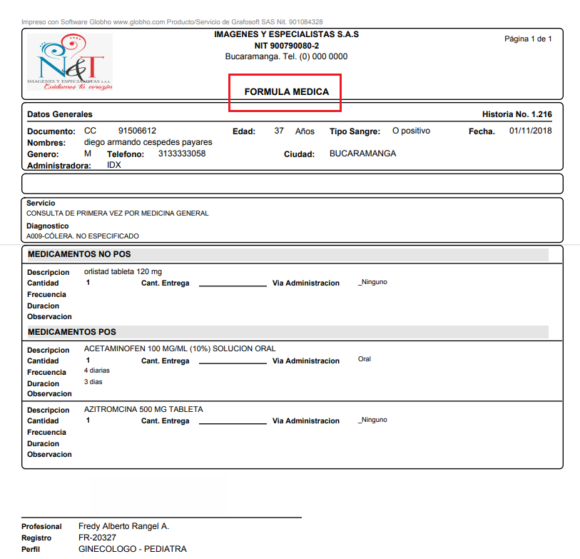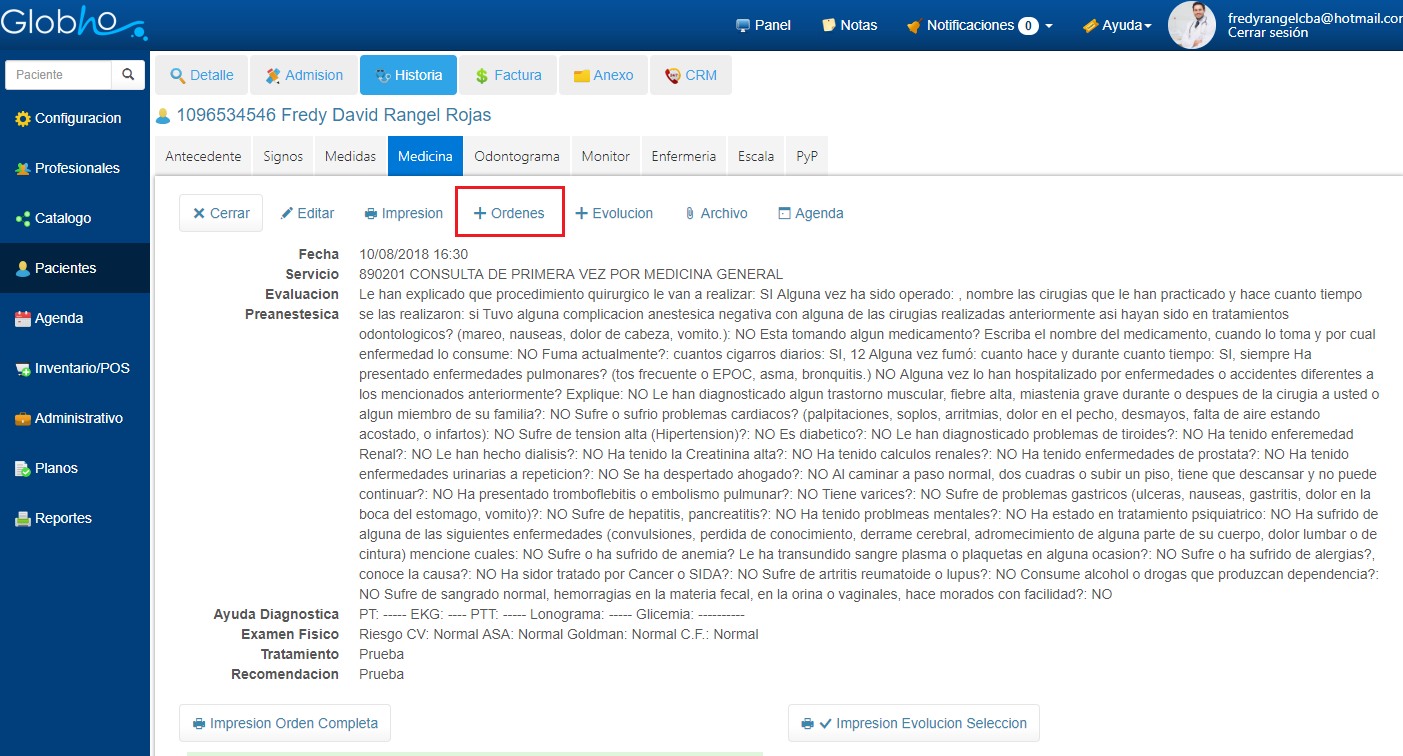 Los campos Vía, Frecuencia y Duración son Opcionales, se diligencian sólo en caso de Orden de Medicamentos. Al finalizar tu Registro de Orden Médica podrás realizar acciones de Editar e Imprimir haciendo clic sobre los respectivos botones. Cuando la orden contiene medicamentos, al Imprimir su Nombre Cambia de ORDEN a FORMULA MÉDICA