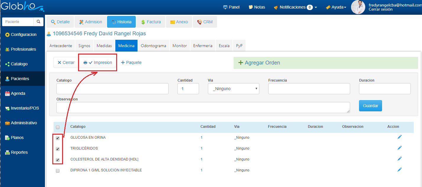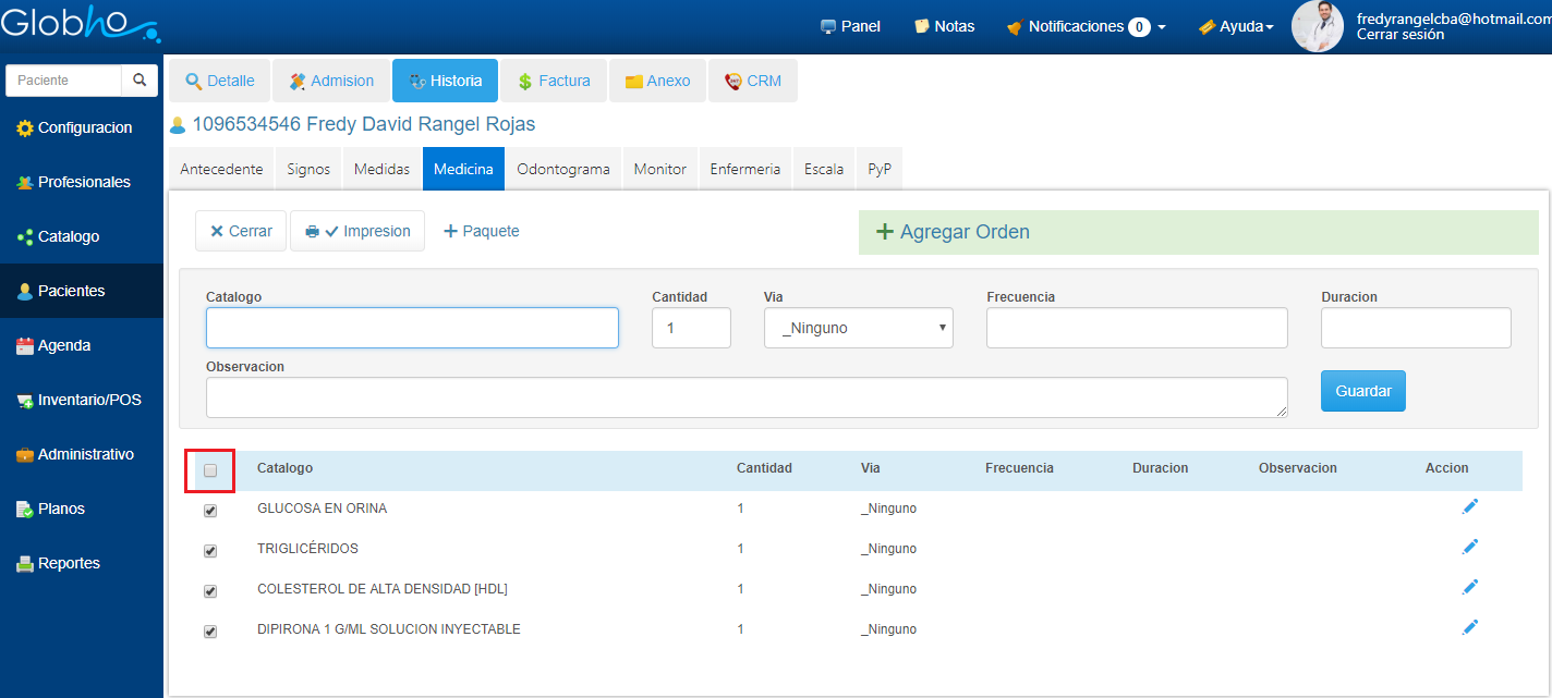 1. Al terminar de Agregar los items a la Orden Médica, debes seleccionar los items que deseas Imprimir. Para lo anterior haz doble clic sobre la casilla de verificación Catálogo.