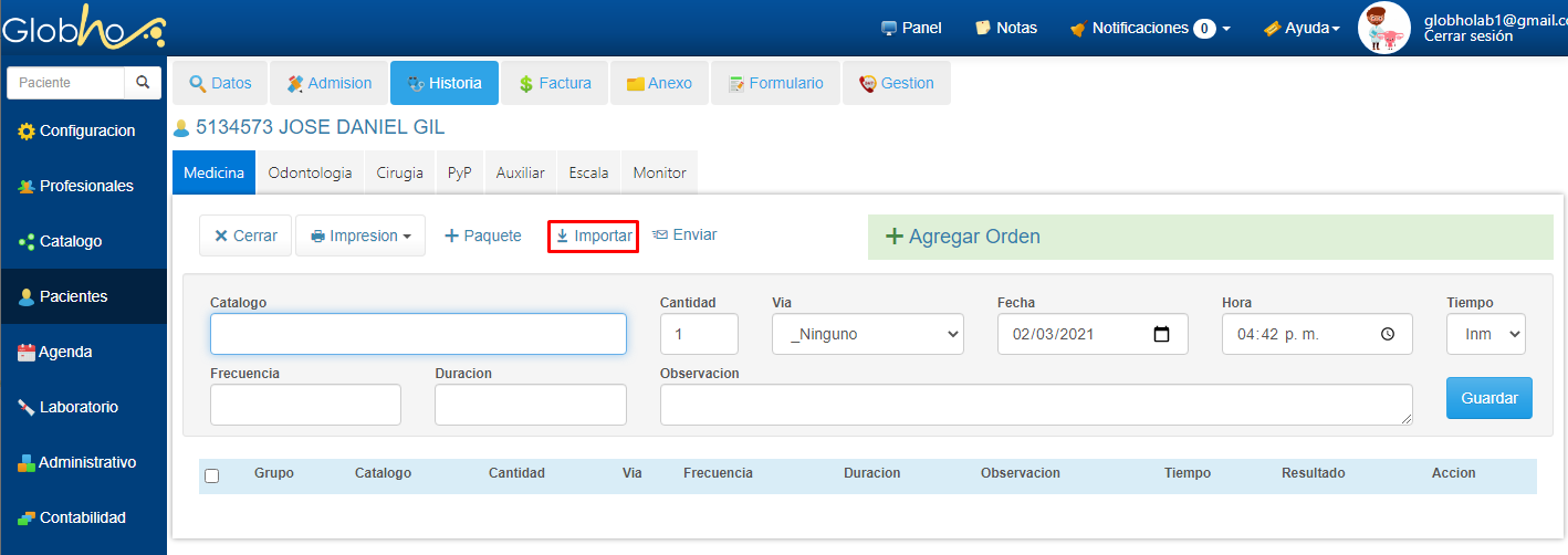1. En el detalle de Orden Médica, haz clic en el botón + Importar.