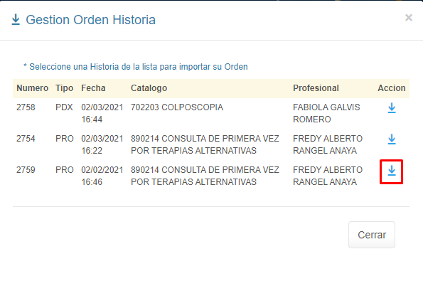 2. Haz clic sobre la flecha hacia abajo, correspondiente a la orden creada en un Servicio Anterior.