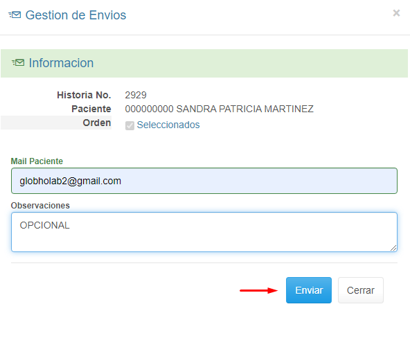 1. En el detalle de Orden Médica, haz clic en el botón + Enviar.