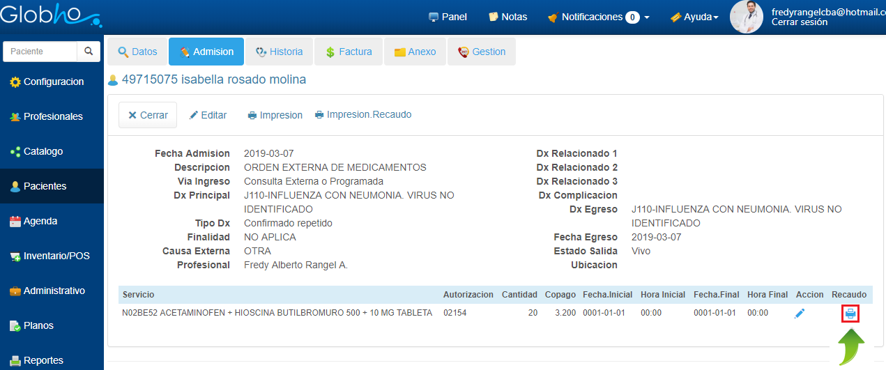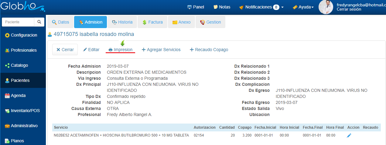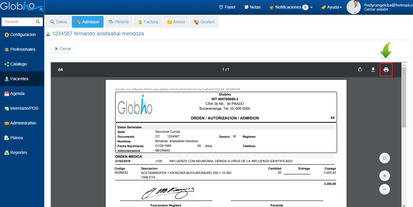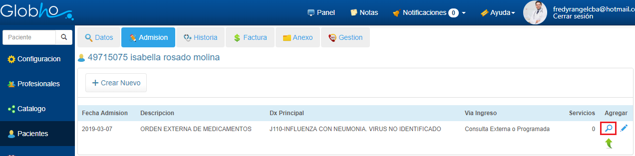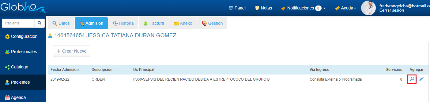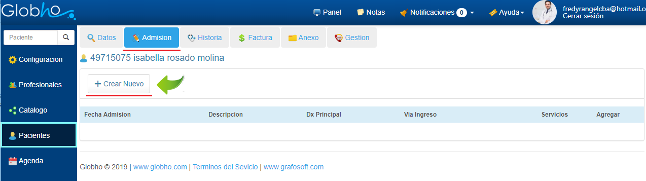 1. Selecciona el Paciente al que le vas a registrar Orden Médica. Ver aquí 2. Haz clic en Admisión y selecciona el botón Crear Nuevo.