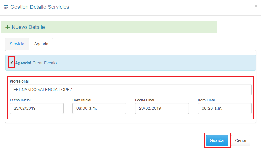 6. Ubicate en la sección Agenda, selecciona la casilla de verificación Agenda! Crear Evento, digita los datos del formato y haz clic en el botón Guardar.