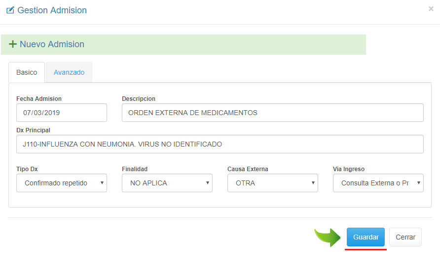 3. Diligencia los datos básicos del formato de Admisión y haz clic en el botón Guardar.