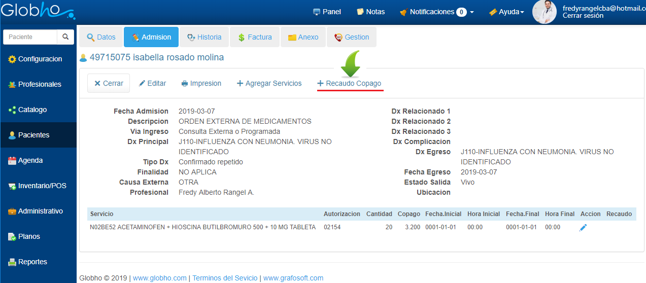 1. Una vez agregados los Elementos (Consultas, Medicamentos, Ayudas DX) a la Orden, haz clic en + Recado Copago.
