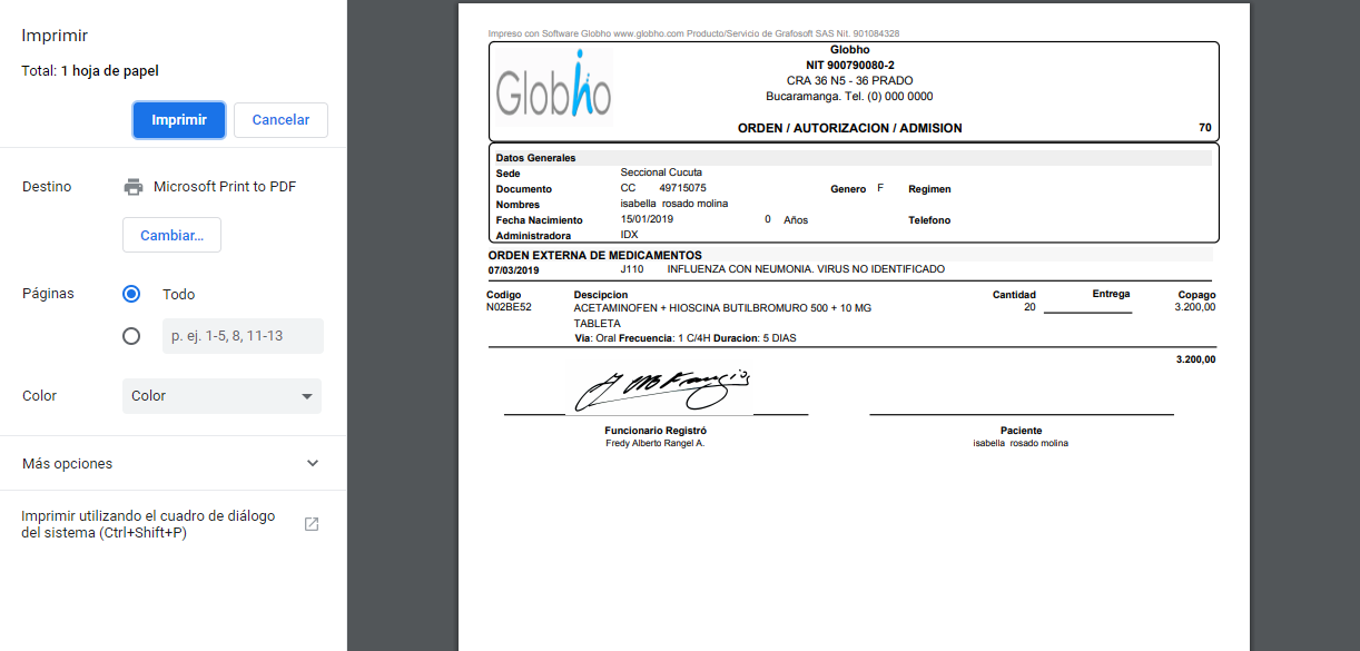 9. Desliza el puntero de mouse para que se visualicen los botones superiores y haz clic en el botón en forma de Impresora. La Orden Impresa se visualiza de la siguiente manera.