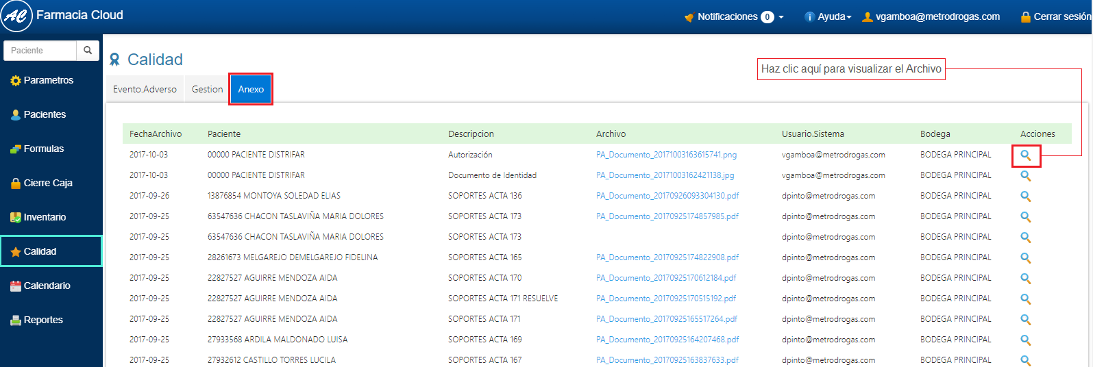 5. Para visualizar los registros de Gestión, elige la opción Calidad del Menú Principal y posteriormente haz clic en la sección Anexo.