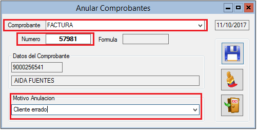 2. Selecciona el tipo Comprobante, ingresa Numero de Formula y Motivo de Anulación.