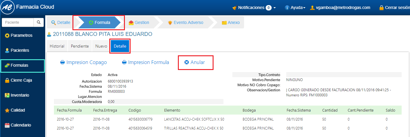 – Para Anular Formulas en FarmaCloud, debes tener en cuenta que estas no deben tener ningùn Movimiento asociado, de lo contrario, se debe hacer la Anulación desde el Escritorio Remoto. |