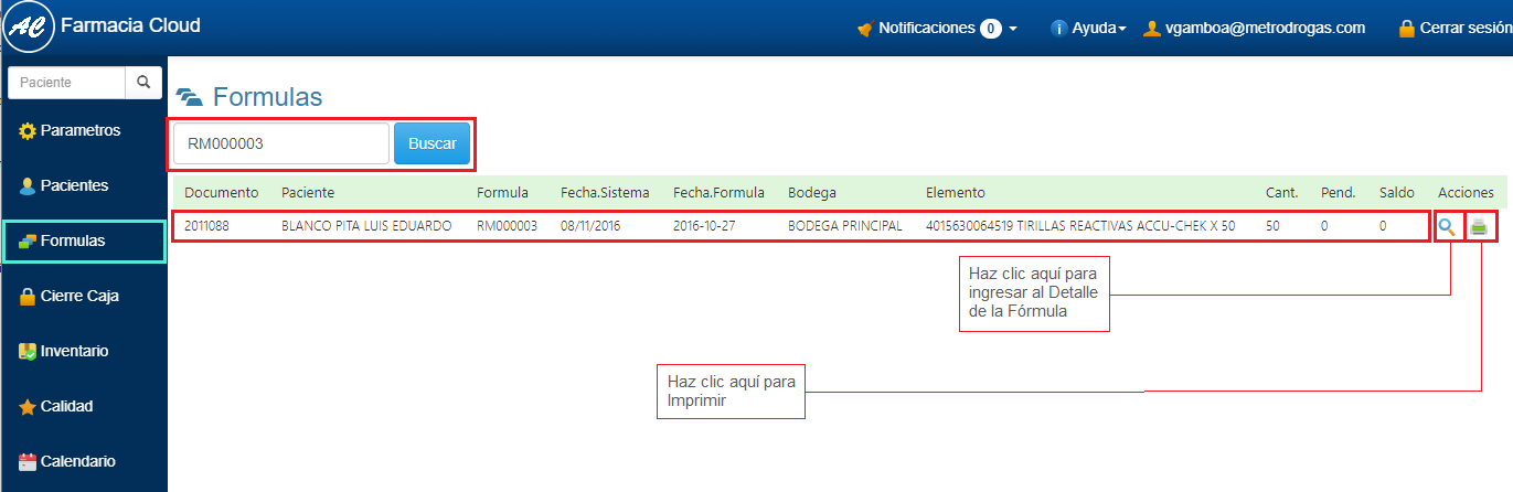 1. Selecciona la opción Fórmulas en el Menú Principal. 2. En la Barra de Búsqueda del sistema digita el Número de la Fórmula.