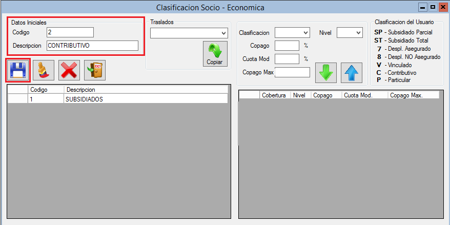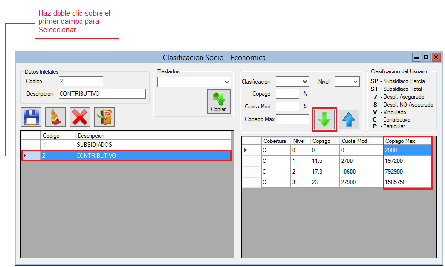 3. Selecciona Grupo de Clasificación y configura los valores de Copago y haz clic en Guardar.