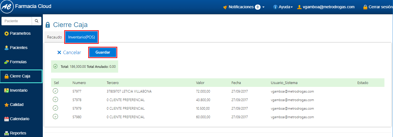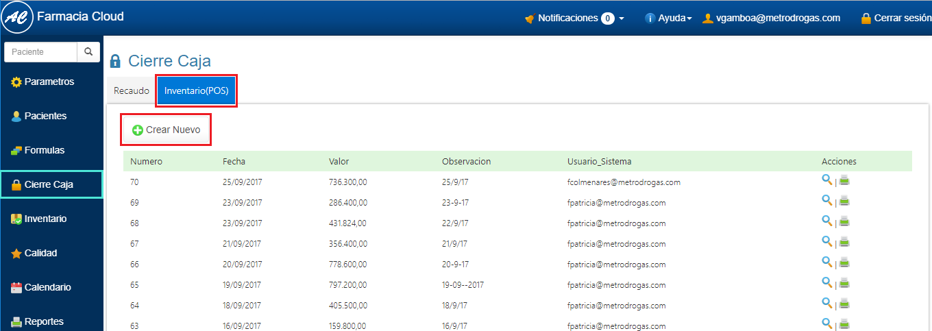 1. Ingresa a Cierre Caja en el Menú Principal de FarmaCloud. 2. Selecciona Inventario(POS) y haz clic en Crear Nuevo.