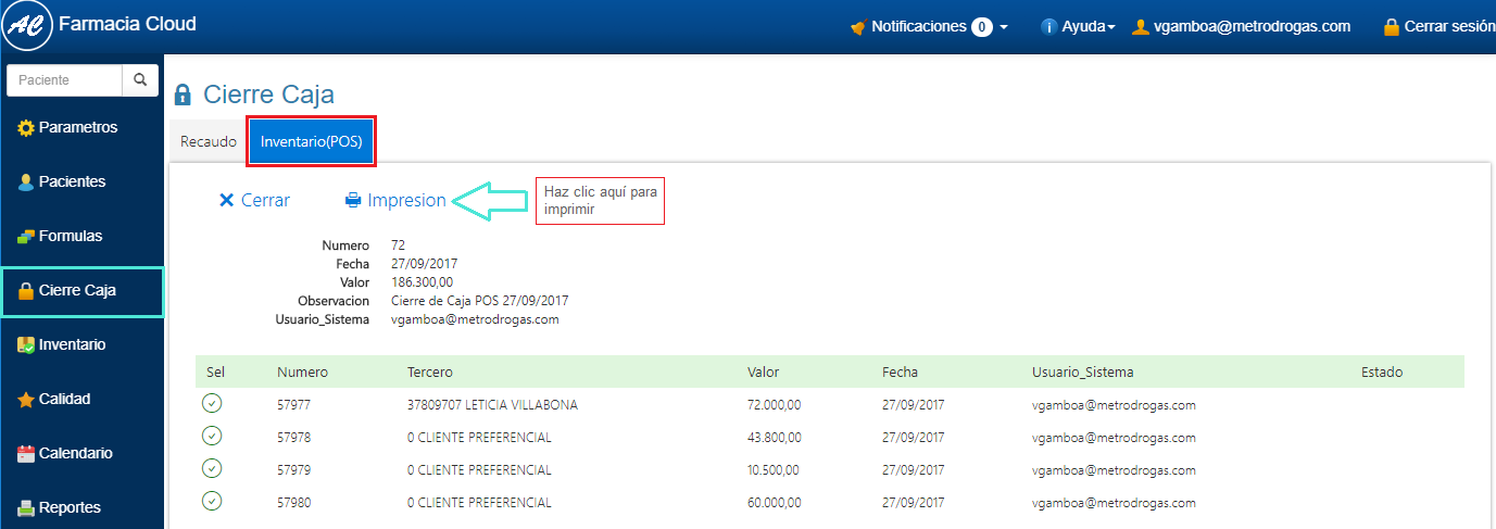 5. El Cierre de Caja se visualiza de la siguente manera: