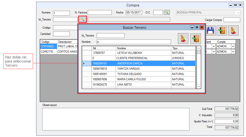 3. Ingresa los campos Id_Tercero y Código, haciendo clic en el botón de Búsqueda