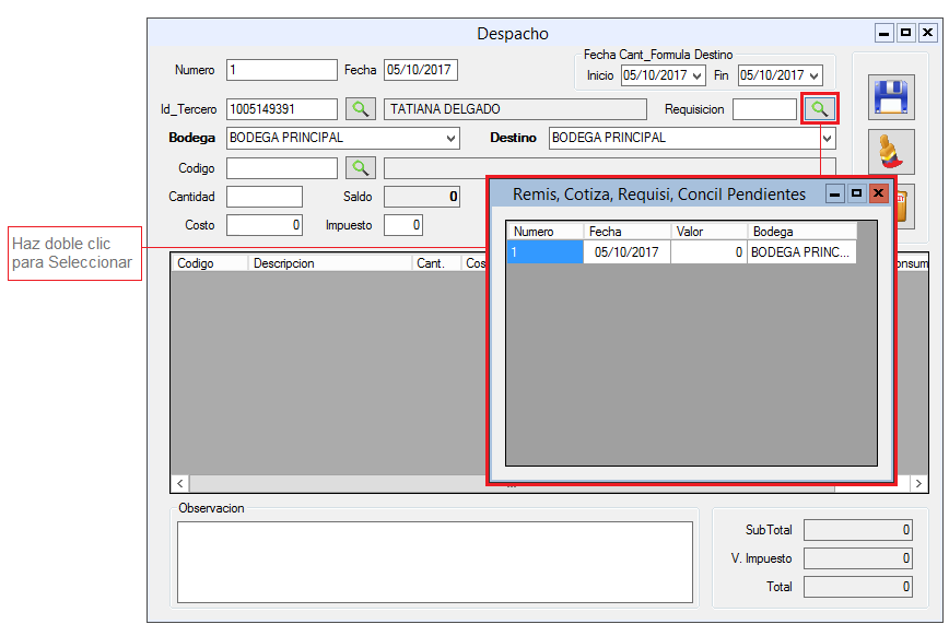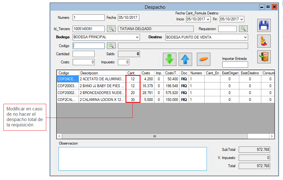 2. Diligencia los Campos Tercero como se realizó en el procedimiento Crear Compra. 3. Selecciona Bodega (origen) y Destino. 4. Selecciona la Requisición (esta debe haber sido creada previamente) 5. En caso de no despachar la cantidad solicitada en la requisición, podrás modificar el campo Cantidad.