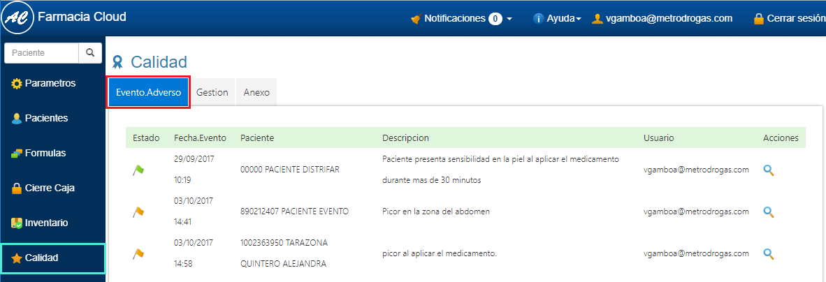 4. Los Eventos Adversos registrados se pueden visualizar ingresando a la opción de Calidad en la sección Evento Adverso.