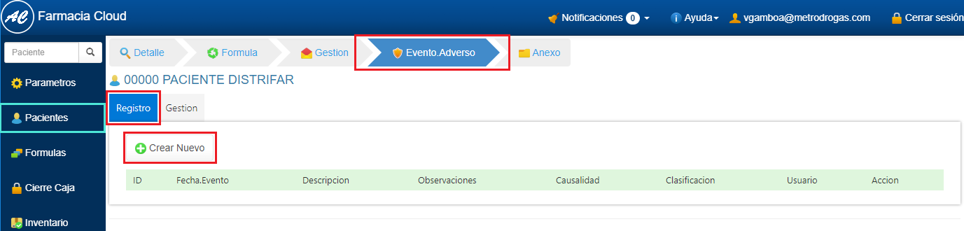 1. Ingrese al perfil del Paciente a quien va a registrar el Evento Adverso. 2. Elige la opción Evento Adverso, en la sección Registro, haz clic en el botón Crear Nuevo.