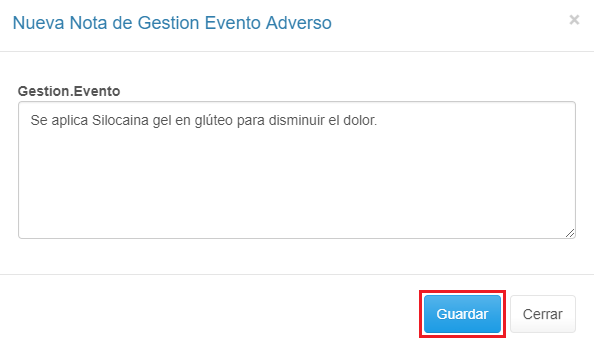 3. Diligencia el Formularo Nueva Nota de Evento Adverso y haz clic en el botón Guardar.