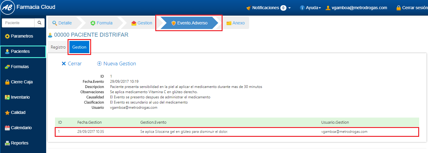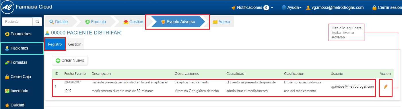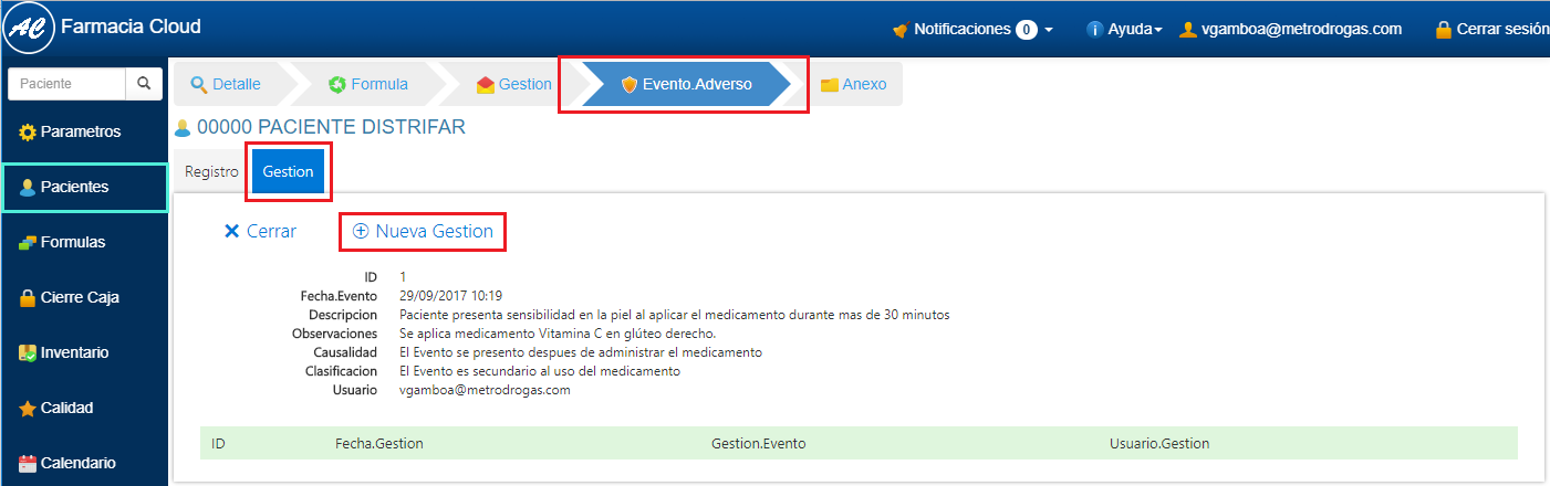 2. Selecciona el Evento Adverso al que vas a hacer la Gestión, haciendo clic en el icono en forma de Lápiz ubicado al final de cada registro de Evento Adverso. 3. En el Detalle del Evento Adverso, selecciona la opción Nueva Gestión.