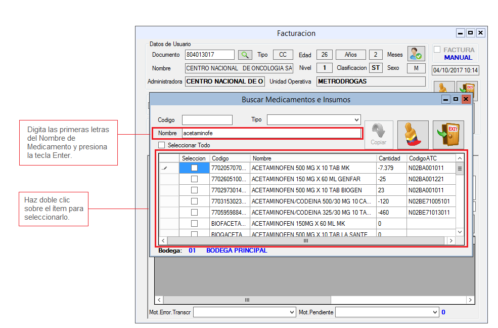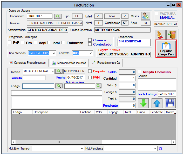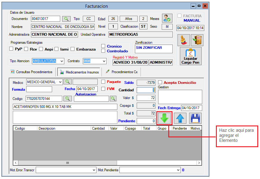 2. Diligencia identificación del Paciente. 3. Selecciona Tipo de Atención y Contrato y haz clic en la tecla Enter. 4. Haz clic en la pestaña Medicamentos Insumos. 5. Selecciona Médico 6. Digita Numero de Fórmula, Fecha y Autorización. 7. Haz clic en el icono en forma de Lupa ubidado en el campo Código.