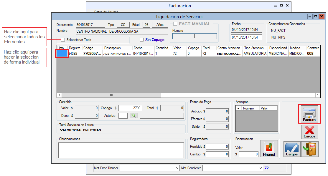 2. Selecciona los Elementos y haz clic en en botón Factura.