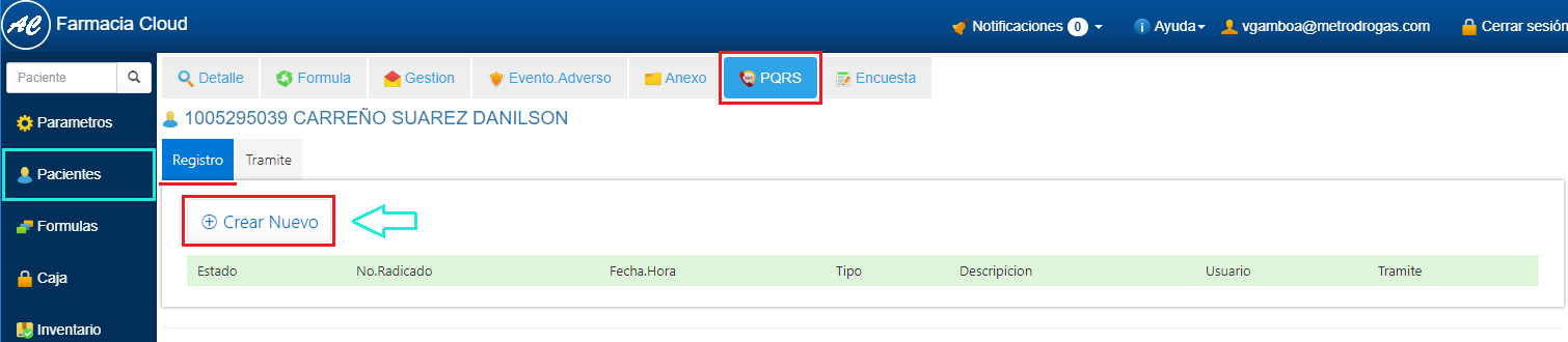 1. Realiza la búsqueda del Paciente e Ingresa al Detalle. Ver aquí 2. Selecciona la pestalla PQRS. 3. En la sección Registro, haz clic en el botón Crear Nuevo.