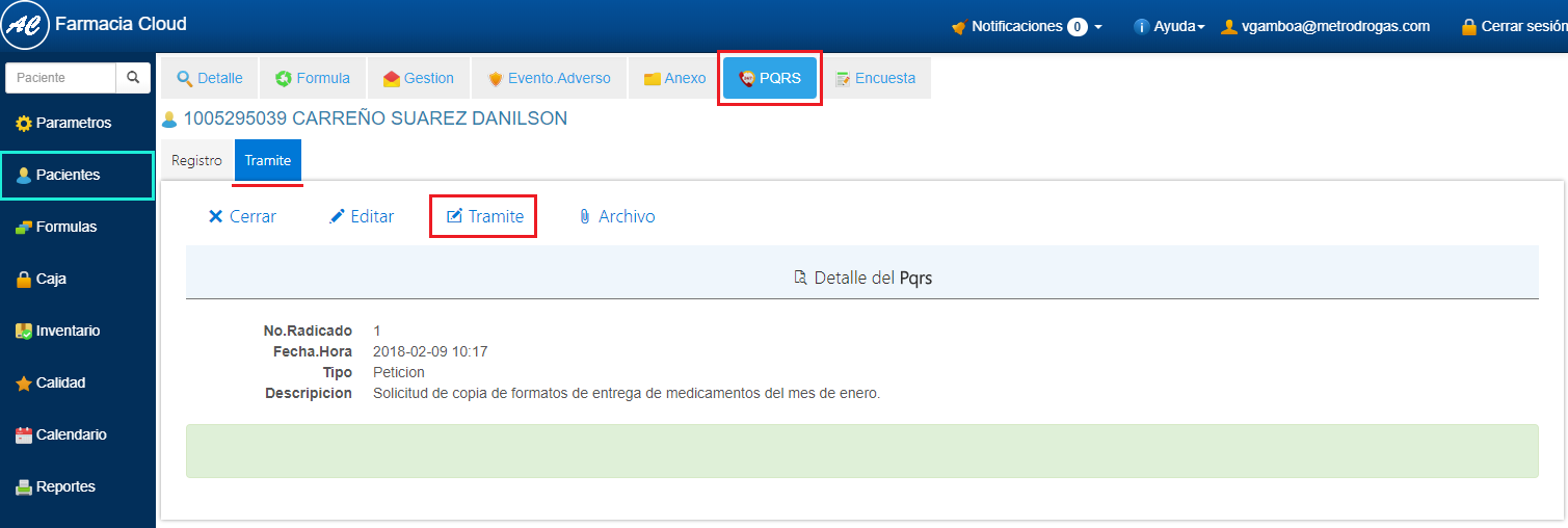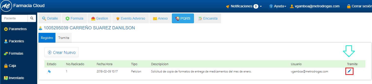 1. Realiza la búsqueda del Paciente e Ingresa al Detalle. Ver aquí 2. Selecciona la pestalla PQRS. 3. En la sección Registro, haz clic en el botón en forma de Lápiz ubicado al final del registro de la PQRS que deseas gestionar.
