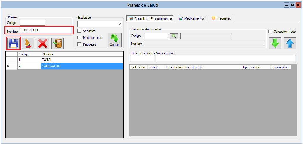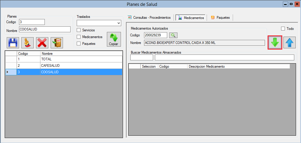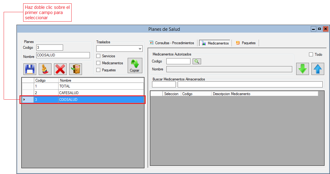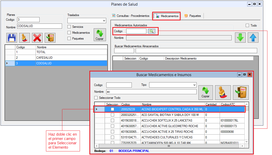 5. haz clic en Medicamentos y Selecciona los Elementos asociados al Plan.