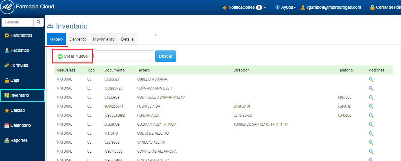 1. Ingresa a Inventario en el Menú Principal de FarmaCloud. 2. Selecciona Tercero y haz clic en el botón Crear Nuevo.