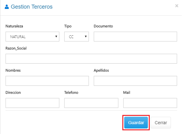 3. Diligencia el Formulario Gestión Tercero y finaliza el registro haciendo clic en el botón Guardar.