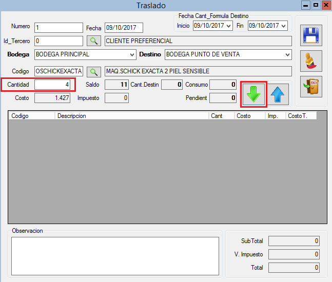 5. Digita la Cantidad del Traslado y haz clic en el botón Agregar.
