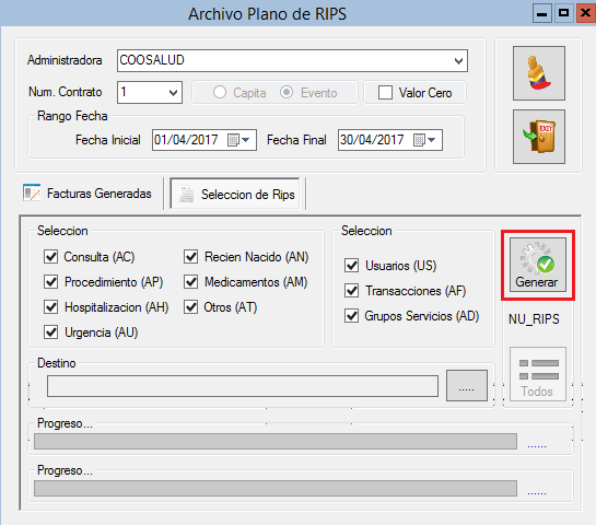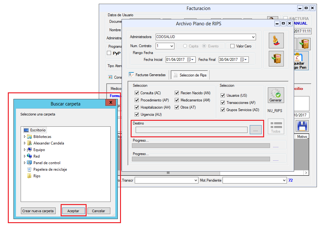 4. Haz clic en Seleccion de RIps y selecciona la carpeta en donde se va a Guardar el Archivo.