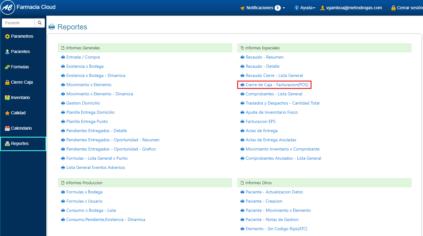 Ejemplo: informe Cierre de Caja-Facturación (POS) 1. Selecciona Reportes en el Menú Principal. 2. Haz clic sobre el Reporte que quieres generar, para este caso Cierre de Caja - Facturación (POS)