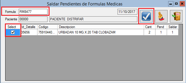 2. Digita el Numero de la Formula, selecciona la casilla de verificación al inicio del registro y haz clic en el botón en forma de Visto Bueno..