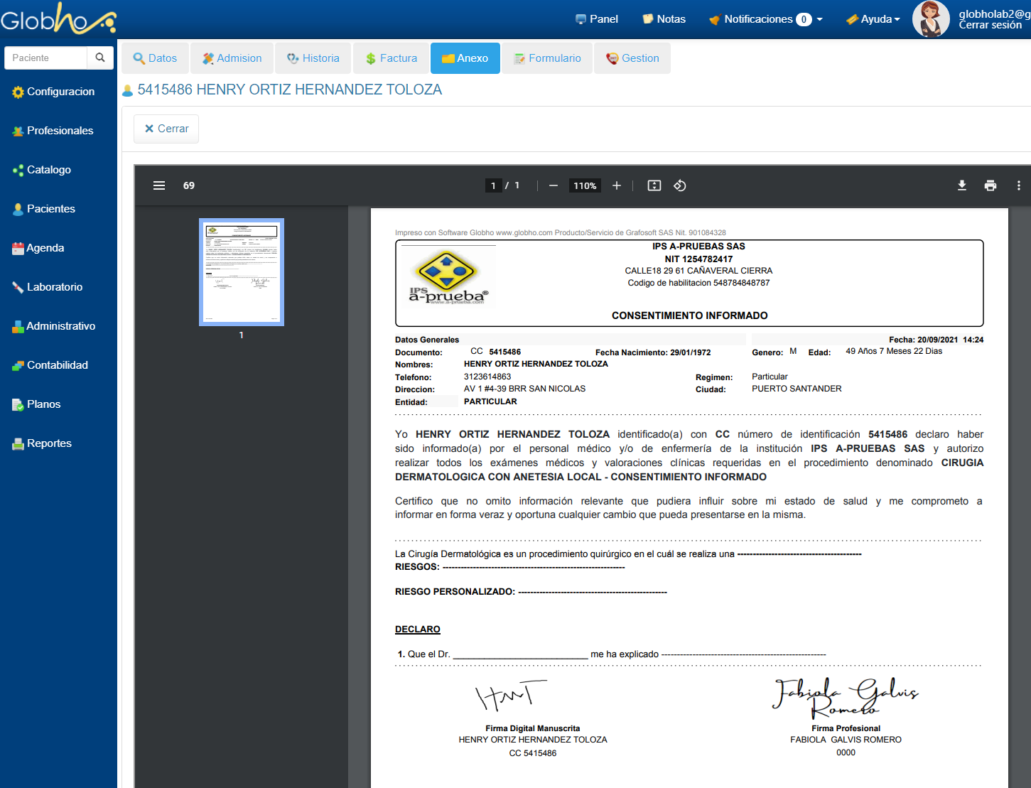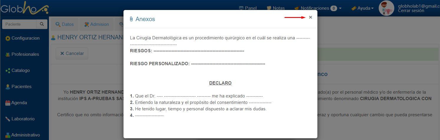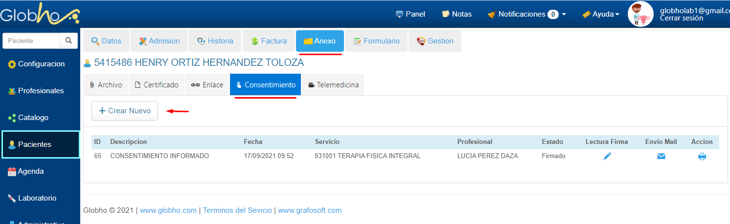 1. Selecciona Paciente para ingresar a la Historia. Ver aquí 2. En el primer menú horizontal selecciona la opción Anexo, haz clic en la pestaña Consentimiento. 3. Haz clic en el botón Crear Nuevo.