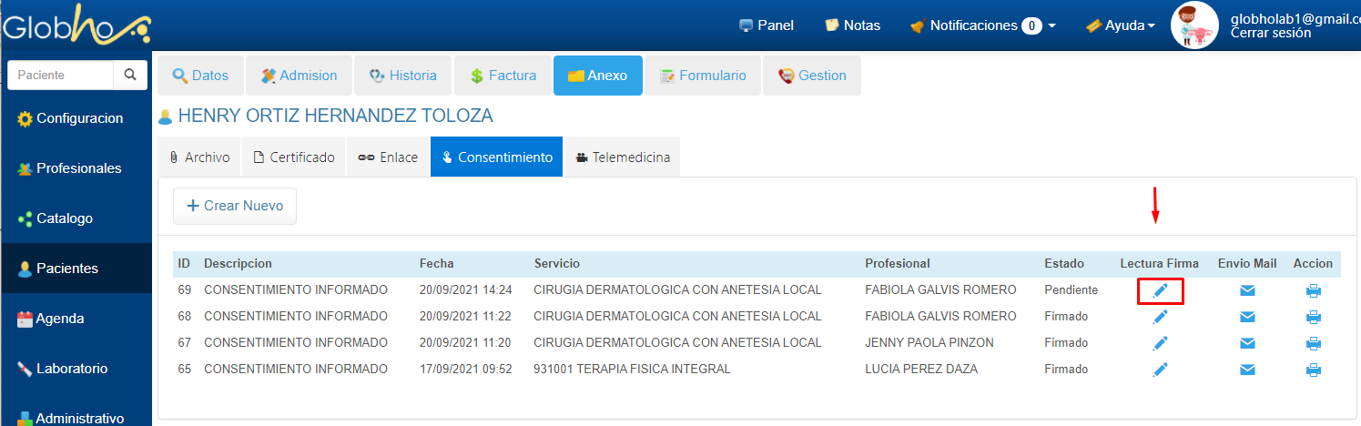 5. Sobre la línea de registro del Consentimiento Informado almacendo, haz clic sobre el botón en forma de Lápiz para visualizar el Texto Anexo al formato genérico del Consentimiento y habilita la opción que permite la firma del paciente por medio de una Tableta, un celular o PC.