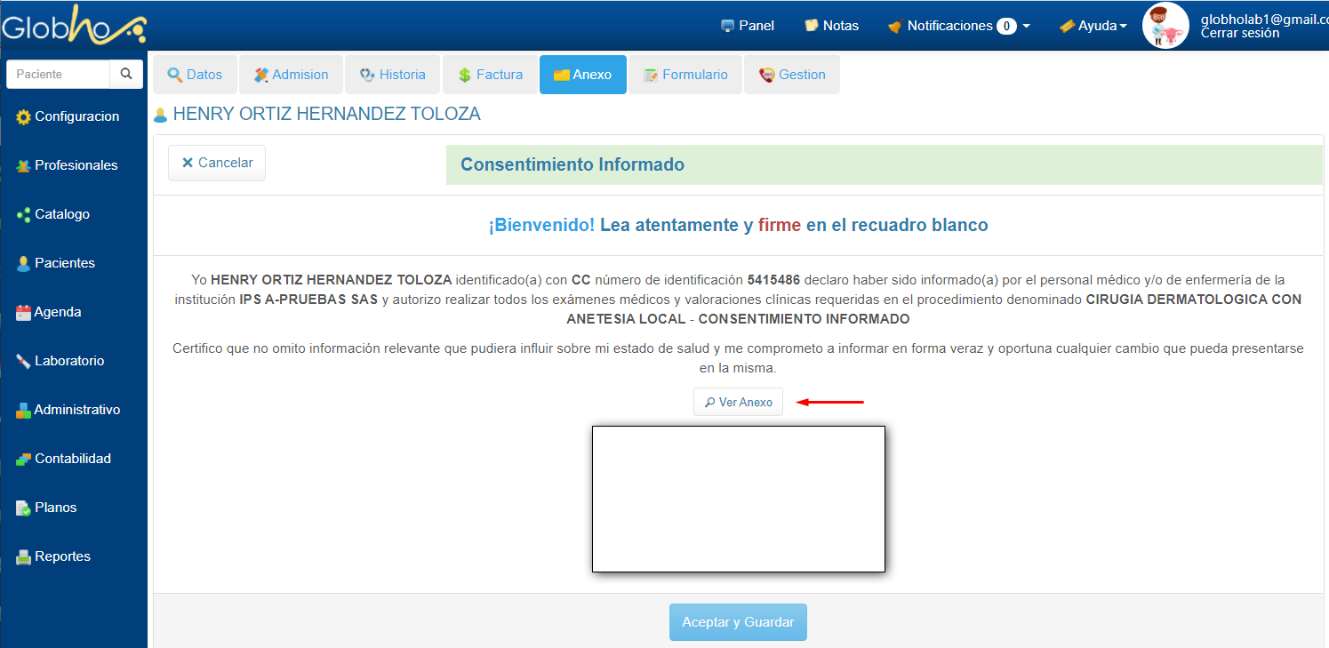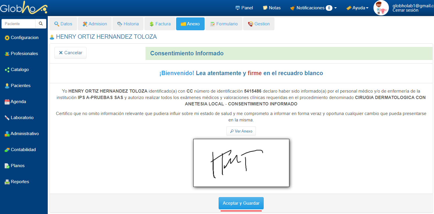 8. El paciente puede proceder a realizar la Firma. 9. Una vez firmado, haz clic en el botón Aceptar y Guardar.