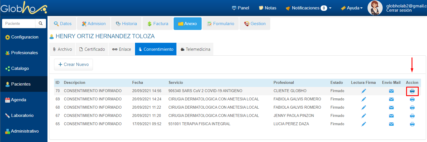 11. Para Imprirmir el Consentimiento, haz clic en el botón en forma de Impresora ubicado al final del registro en la columna Acción