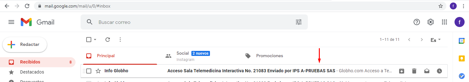 1. Ingresa al correo electrónico que indicaste en el Consultorio o IPS en el momento de la asignación de la Cita, para el envío del link de acceso a la VideoConferencia. 2. Ingresa al Detalle de correo haciendo clic sobre el registro del mismo.