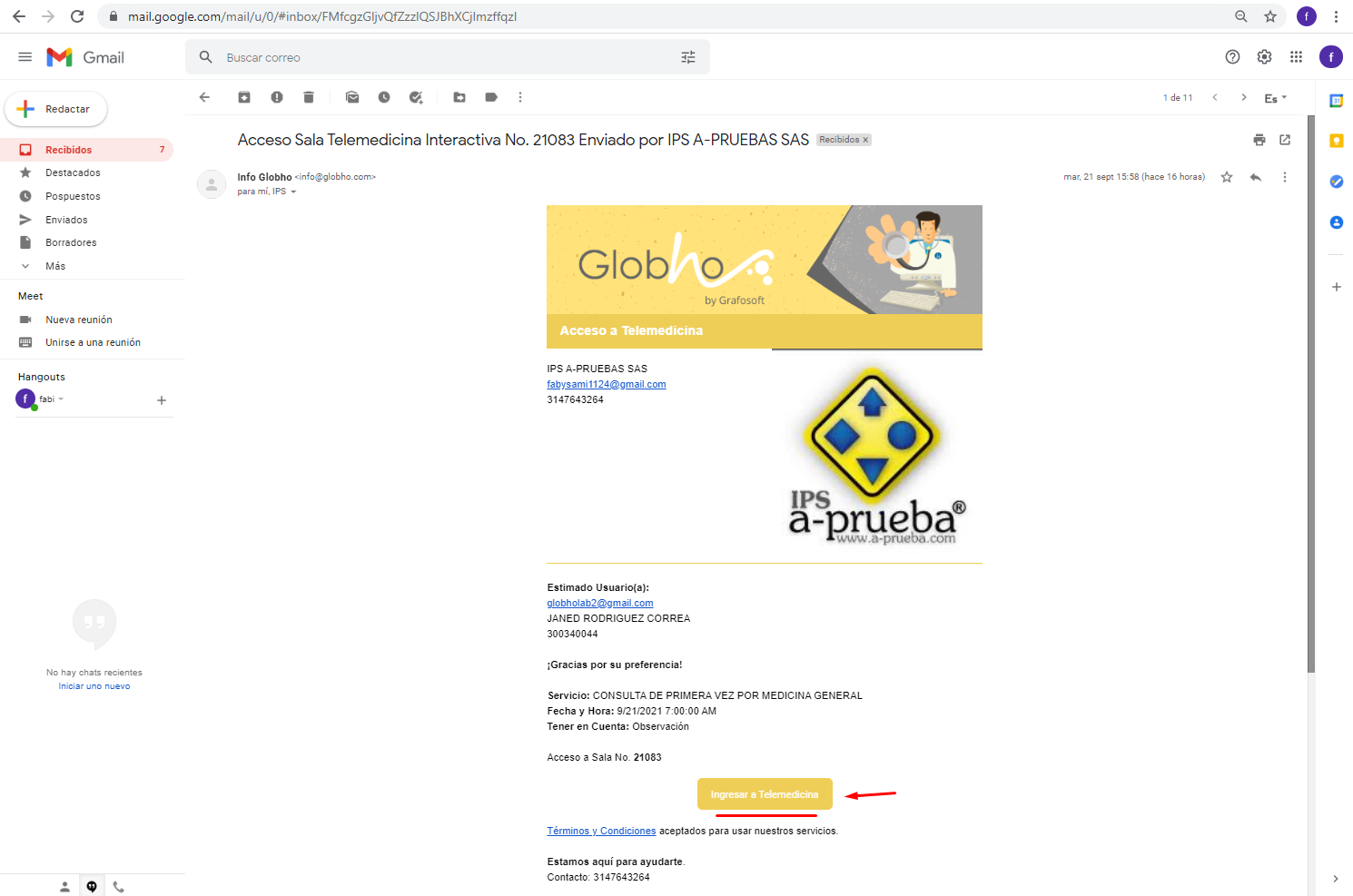 Apartir de la creación de la Agenda Tipo Telemedicina, Globho enviará un correo con el botón de Acceso a la sala al Paciente, que le permitirá al paciente ingresar de forma práctica a la funcionaldad S - Video (Sala interactiva) en tiempo real desde un computador, celular o tablet con acceso a internet y desde todo tipo de navegador web. |