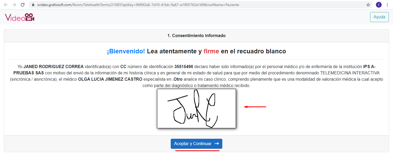 4. Realiza la Firma del Conocimiento Informado y haz clic en el botón Aceptar y Continuar.