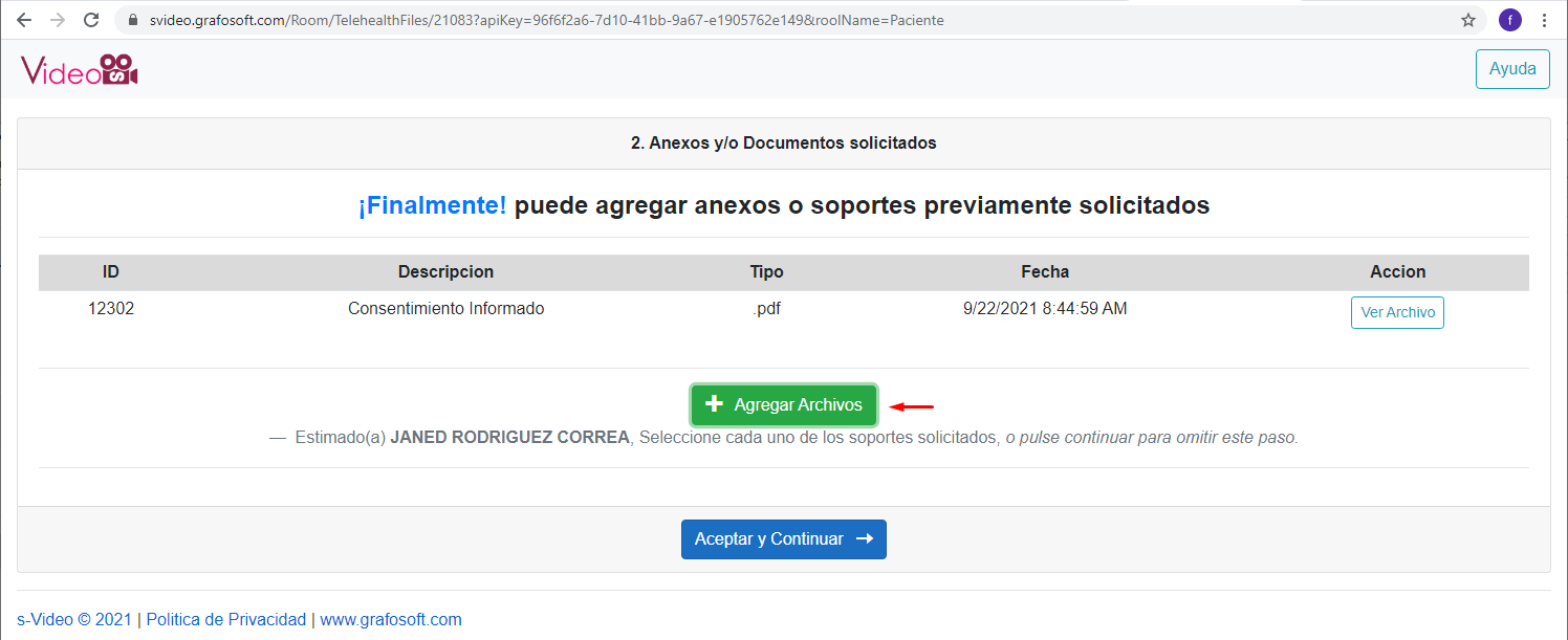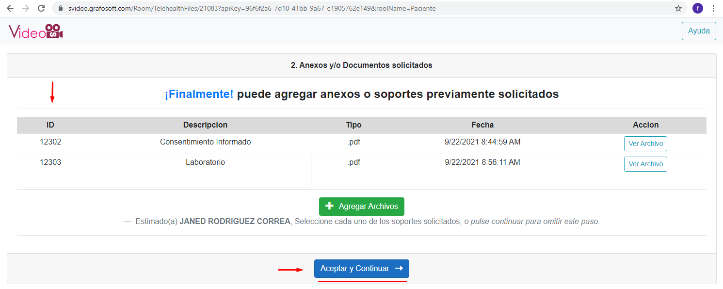 9. Los archivos y consentimiento Informado se visualizan cargados como se ve en la imagen a continuación. Haz clic en el botón Aceptar y Continuar.