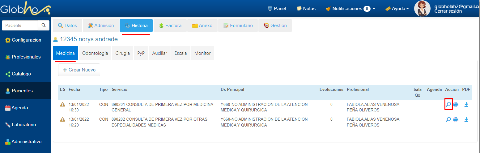 1. Selecciona Paciente para ingresar a la Historia. Ver aquí 2. Haz clic en Historia/Medicina y selecciona el Servicio al cual vas a realizar el Anexo.