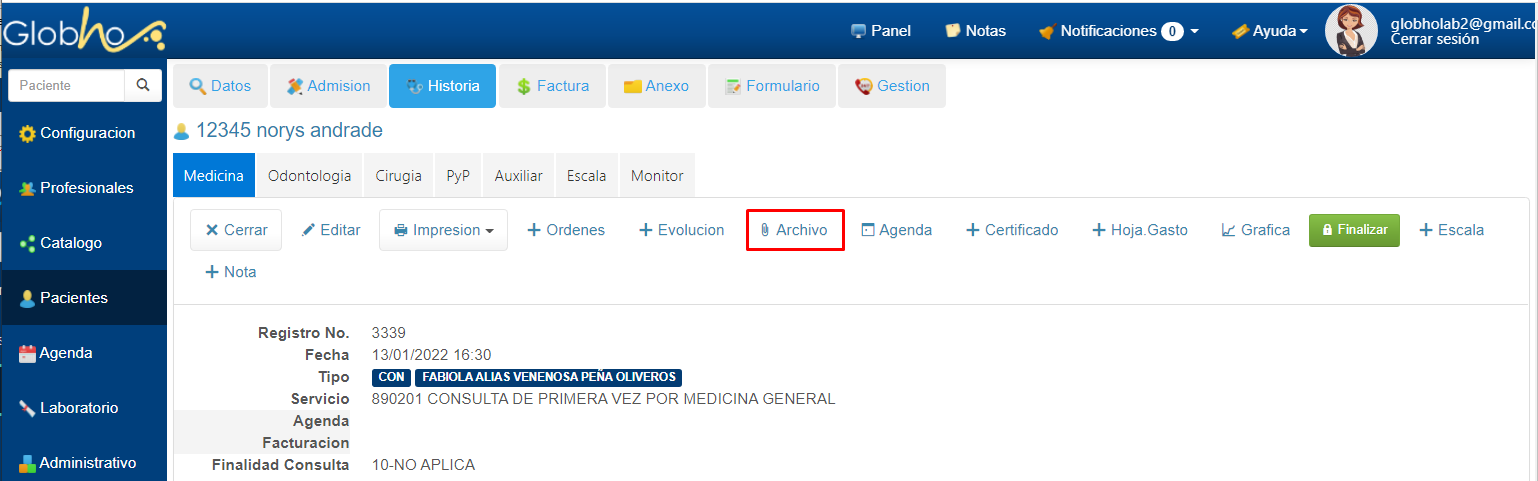 1. Selecciona Paciente. Ver aquí 2. Haz clic en Anexo y selecciona Archivo.