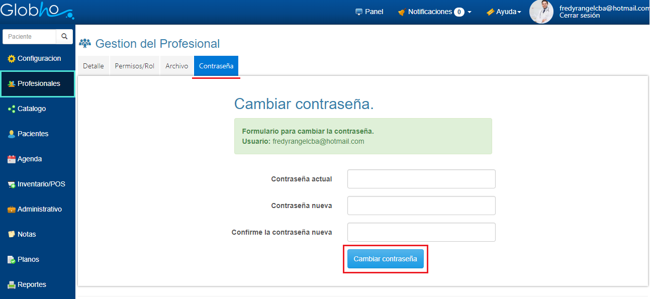 2. Digita la Contraseña Actual, la Nueva Contraseña, confirma la Nueva Contraseña y finalmente haz clic en el botón Cambiar Contraseña.