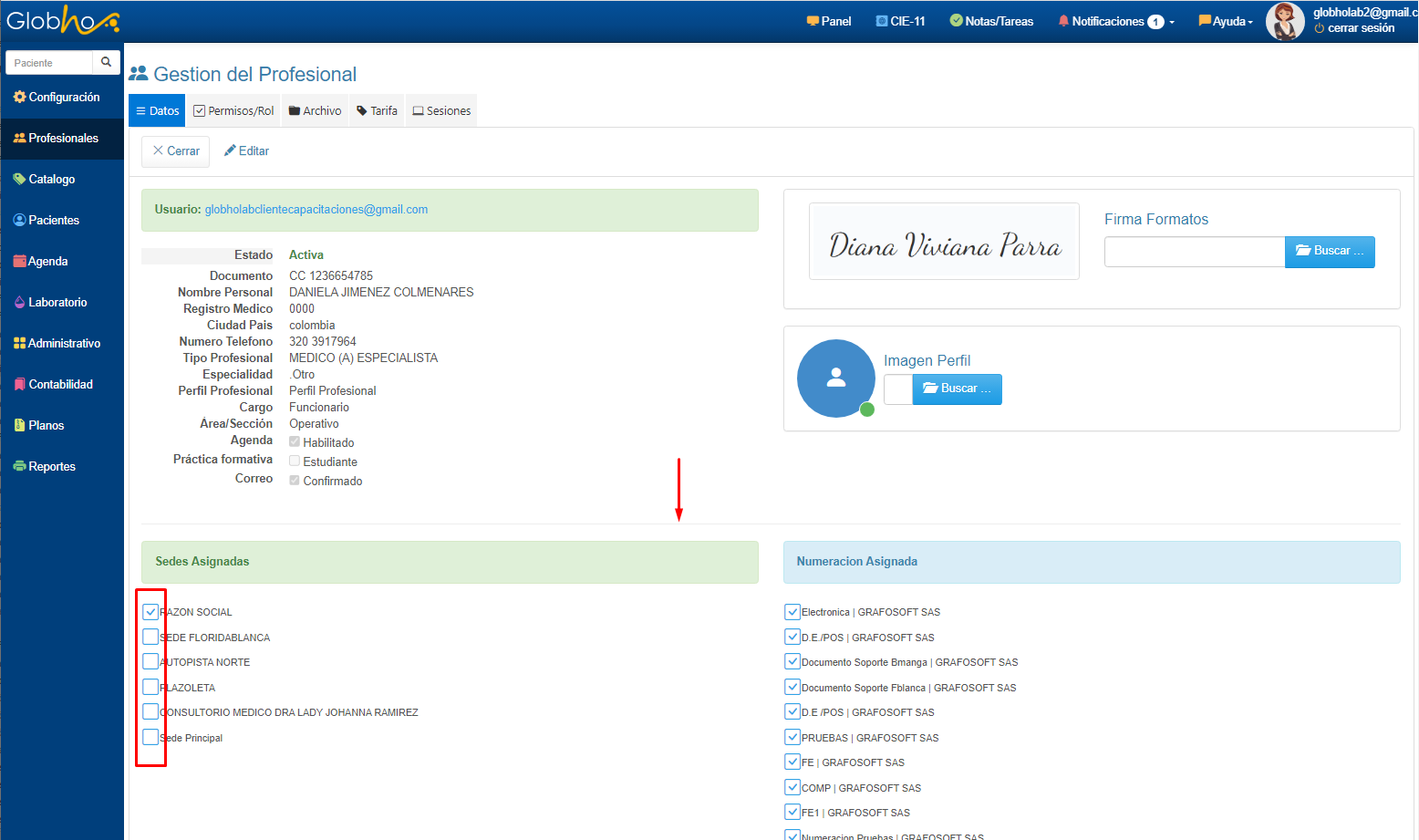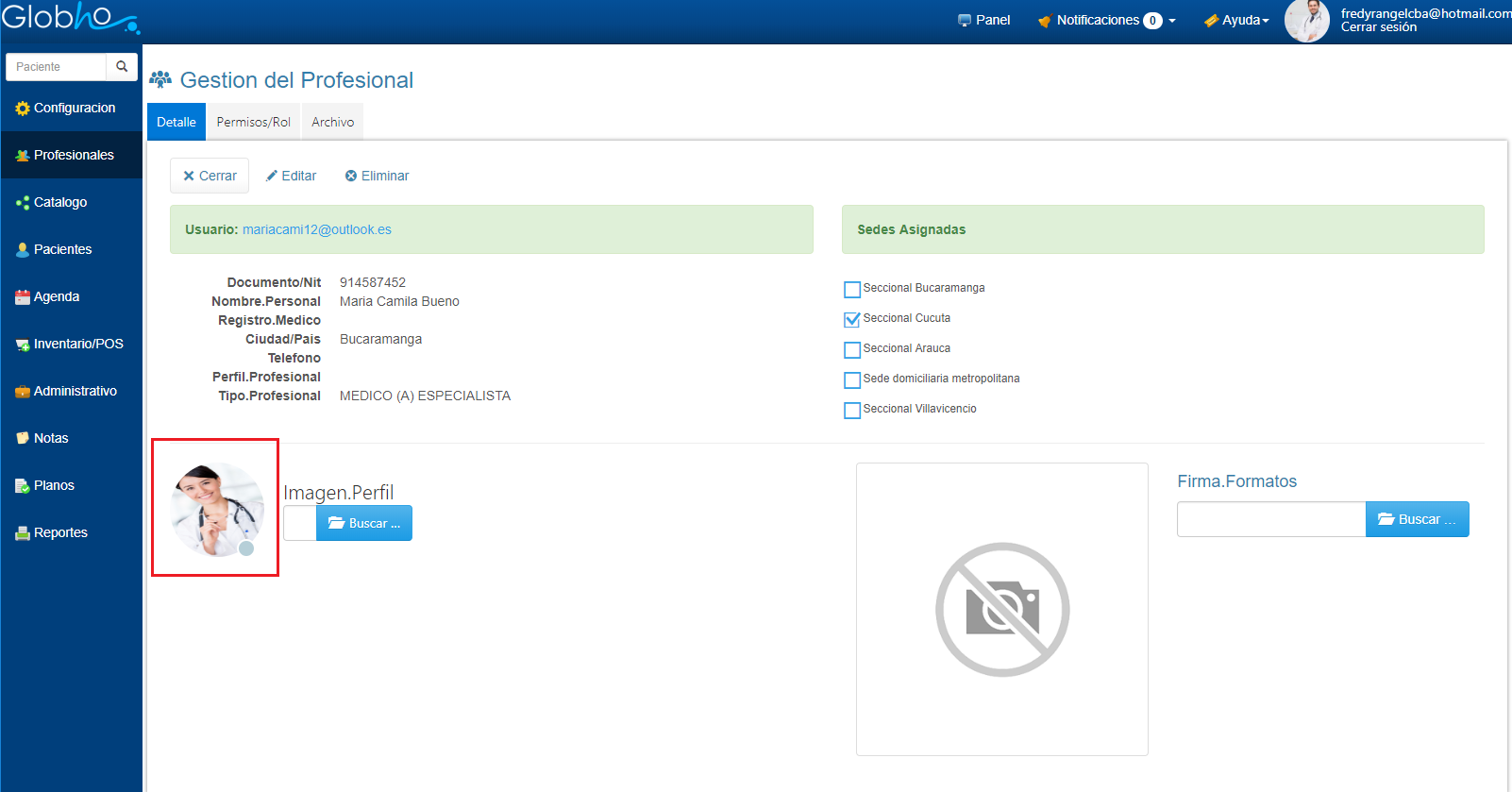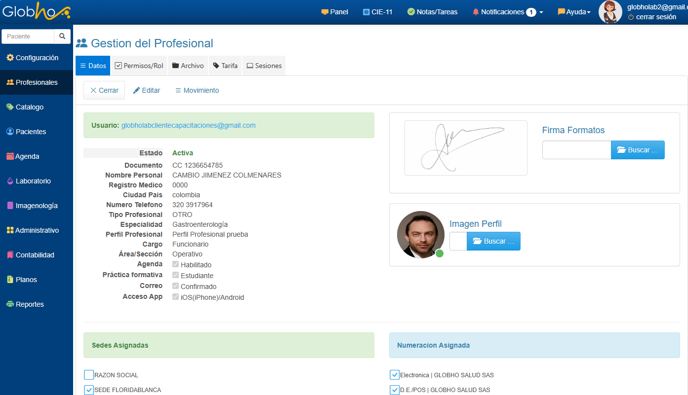 Ahora puedes visualizar Información del profesional como: 🗸 Datos Básicos Personales, 🗸 Estado de Usuario (Activo / Inactivo), 🗸 Rol (Profesional en Salud / Estudiante), 🗸 Habilitación de Agenda, Firma para Formatos, 🗸 Imágen de Perfil, Sedes Asignadas, Númeración Asignada. 🗸 Confirmación del usuario. (correo) 🗸 Acceso APP Globho.