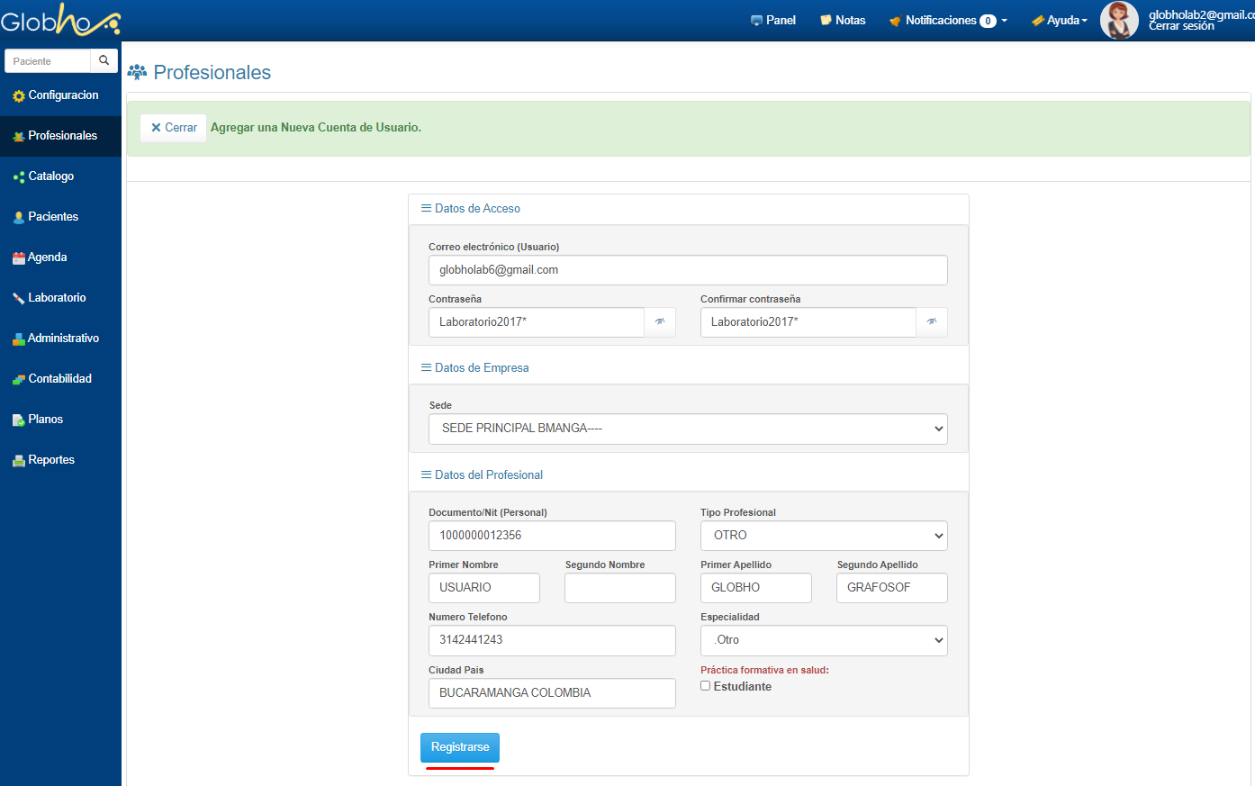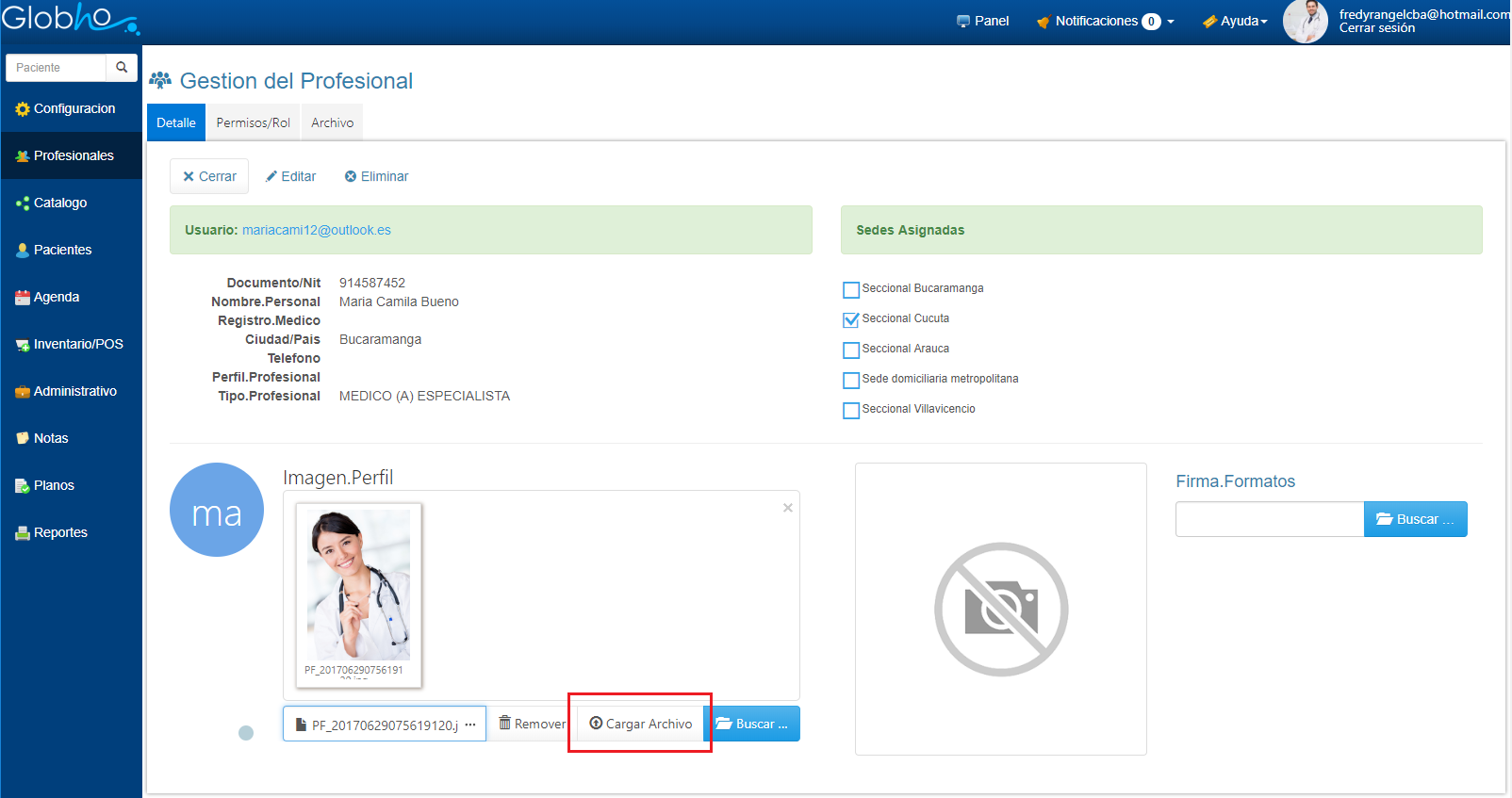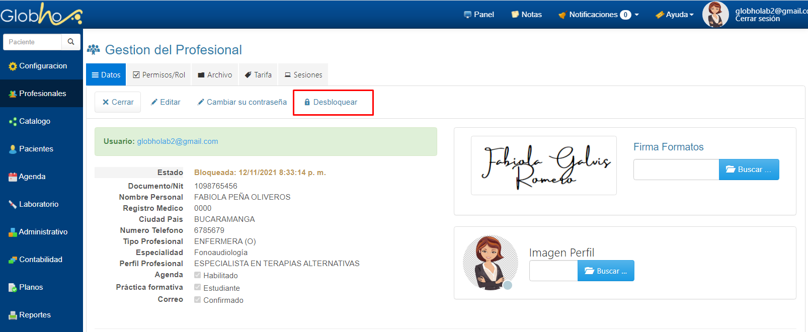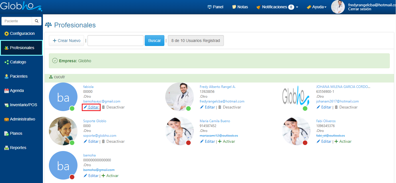 Ahora puedes visualizar Información del profesional como: 🗸 Datos Básicos Personales, 🗸 Estado de Usuario (Activo / Inactivo), 🗸 Rol (Profesional en Salud / Estudiante), 🗸 Habilitación de Agenda, Firma para Formatos, 🗸 Imágen de Perfil, Sedes Asignadas, Númeración Asignada. 🗸 Confirmación del usuario. (correo) 🗸 Acceso APP Globho.