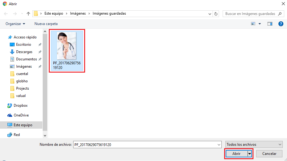 1. Selecciona el Profesional a quien vas a realizar la carga de la imagen. 2. Haz clic en la opción Buscar.